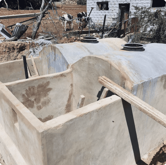 IZRAA’s team conducted several visits to the farm with the biodigester specialist to properly assess the needs and possible designs for the biodigester. The first approach was to utilize the existing manure collection pit but upon further inspection the team opted for excavation of a new pit as the existing one is directly connected to the farms support columns that were showing signs of erosion and the biodigester specialist advised against using the pit as it will need reinforcement and its location will complicate the works needed and will increase the costs. A final design was produced by the biodigester specialist which took into consideration the local terrain, farm layout and number of livestock.
